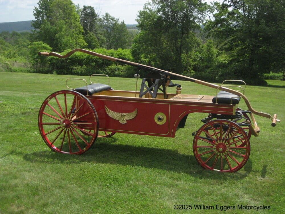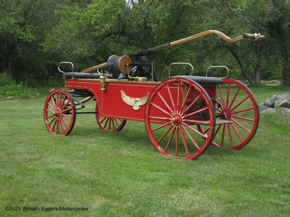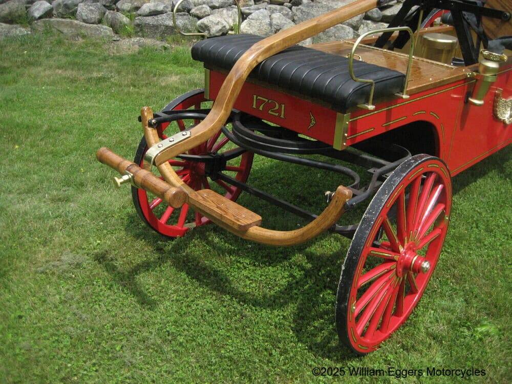 Newsham’s design consisted of a wooden chassis constructed with a long and narrow frame that could easily be maneuvered. Newsham’s engine encompassed a large lever that required the efforts of two men. The two firefighters would then begin pumping by standing with one foot on each side of the pump, throwing their weight upon each treadle alternately. While the crew members were pumping a leather hose was attached to the top of the apparatus that another set of firefighters directed the jet of water at the fire.